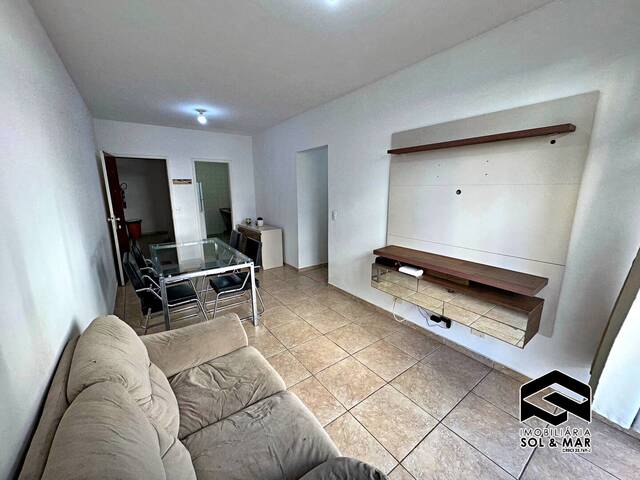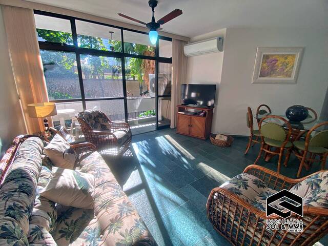 Ampla sala 02 ambientes com sacada de frente02 dormitórios sendo 01 suíte + reversívelBanheiro social Cozinha americana Área de serviço → Prédio com churrasqueira e serviço de praia